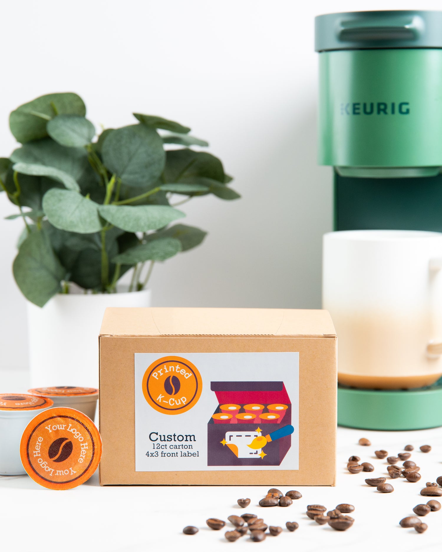 Boost your brand's visibility with custom labeled 12-count K-Cup cartons. Each carton is designed for promotional impact, featuring your logo and message on vibrant, high-quality labels.